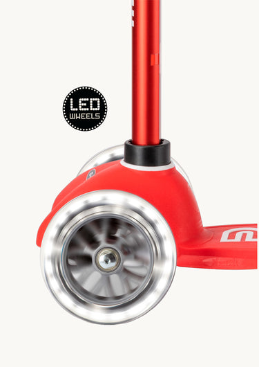 Et flot rødt løbehjul, med hjul der lyser op i farver når de drejer rundt.