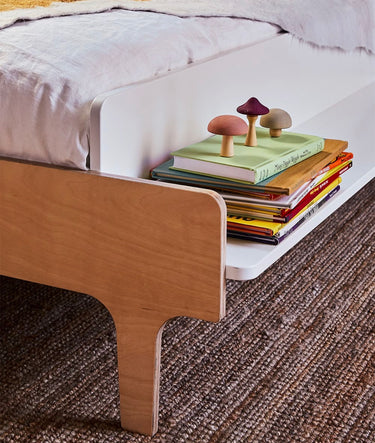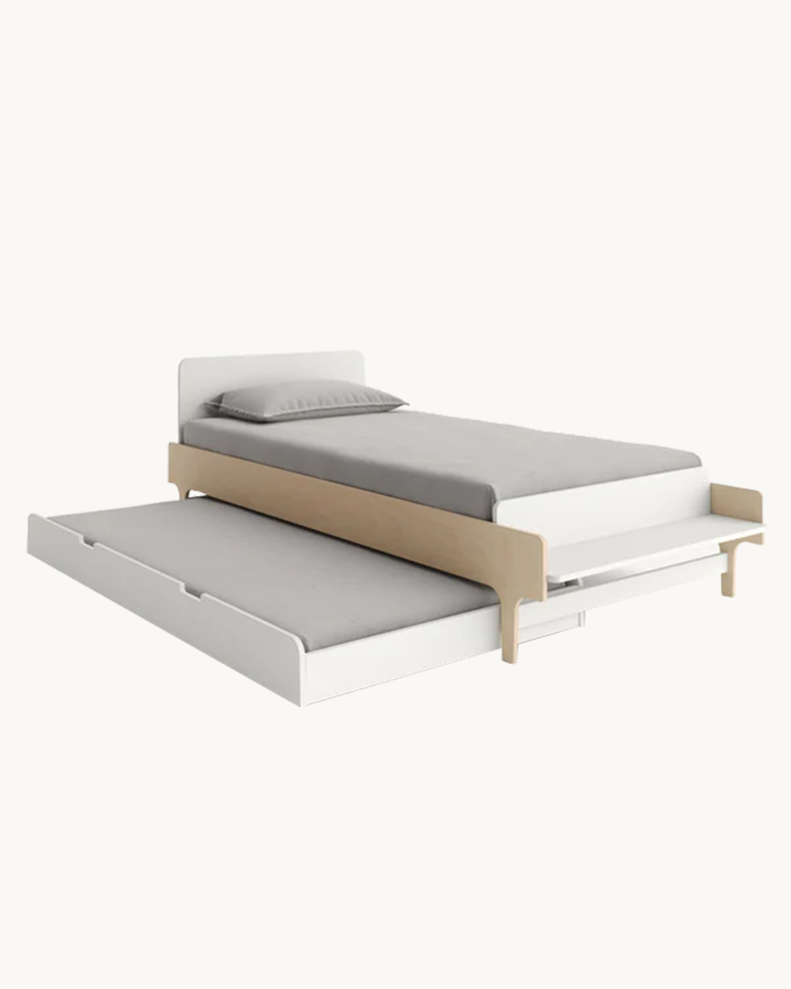 Ved tilkøb af River Udtrækssengen har I altid en ekstra sengeplads ved hånden, der nemt kan trækkes ind og ud under sengen. Uden madras i udtrækssengen kan pladsen her også bruges til opbevaring. River Udtrækssengen købes separat.
