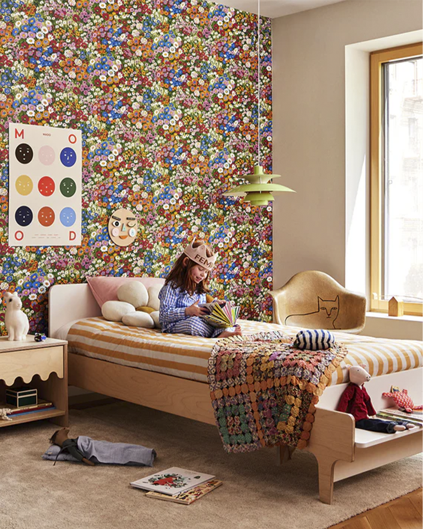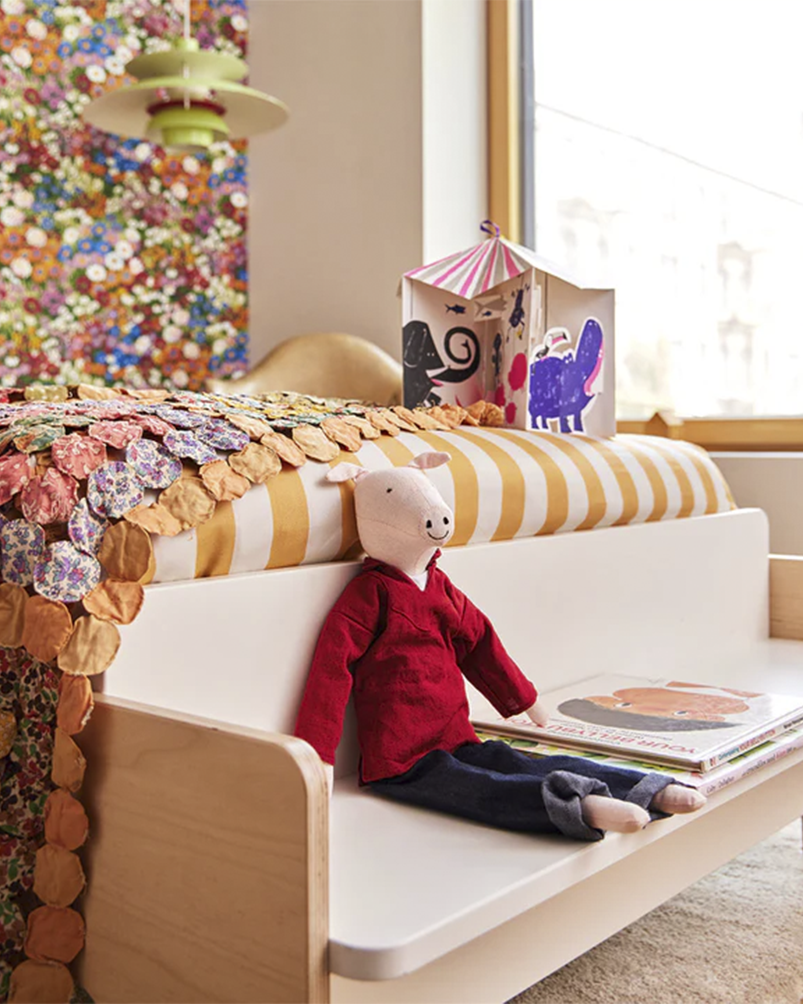 Sengen har et moderne design og kommer med en indbygget bænk for enden af sengen – perfekt til læsning, leg eller som en ekstra siddeplads.