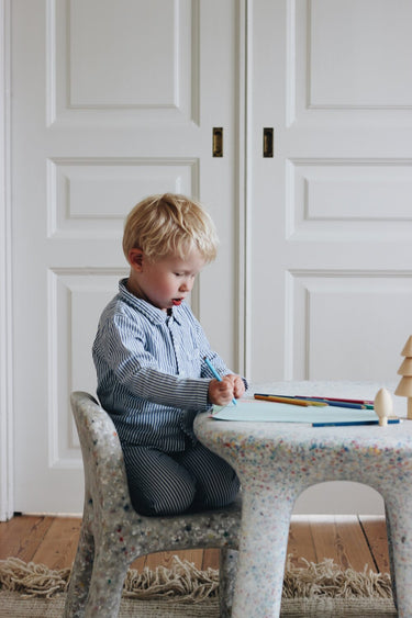 De robuste ben og designet gør stolen stabil at sidde på og lege ved, og de bløde former og afrundede kanter gør den til en sikker stol selv for de allermindste.