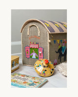 De smukke farver, det praktisk låg (husets tag) og de vidunderlige broderede detaljer gør kurven velegnet til at placere hvor som helst i hjemmet. Alle Raffia opbevaringshuse er håndlavet, og derfor er der ikke to der er ens.