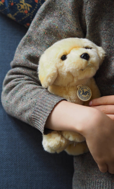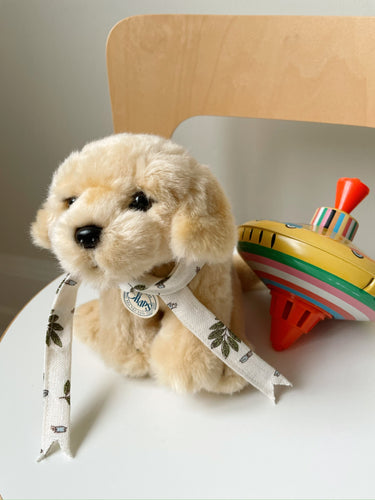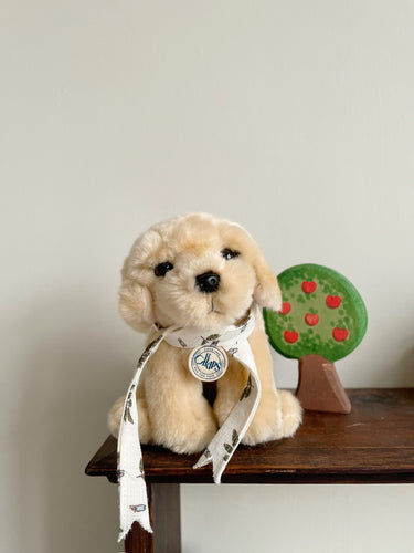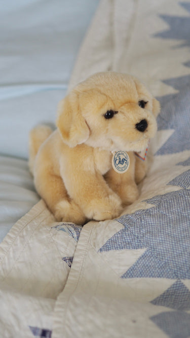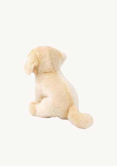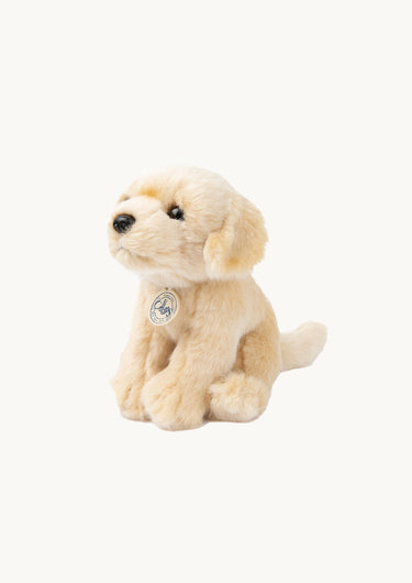 Den blonde søde hund er klar på ture rundt omkring i hjemmet, og har også en god størrelse for at kunne komme med på rejser eller weekendtur. Den er blød, sød og er god til at kramme.