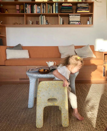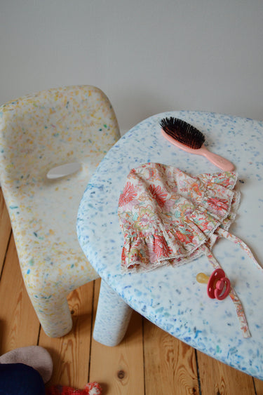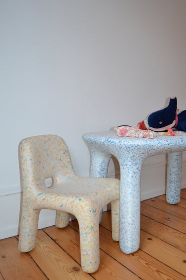 Luisa Table fra det belgiske mærke Ecobirdy er fremstillet af 100% genanvendeligt plast, og er et skønt eksempel på genbrug af gammelt legetøj og andet plastik, der ellers ville være endt på lossepladsen.