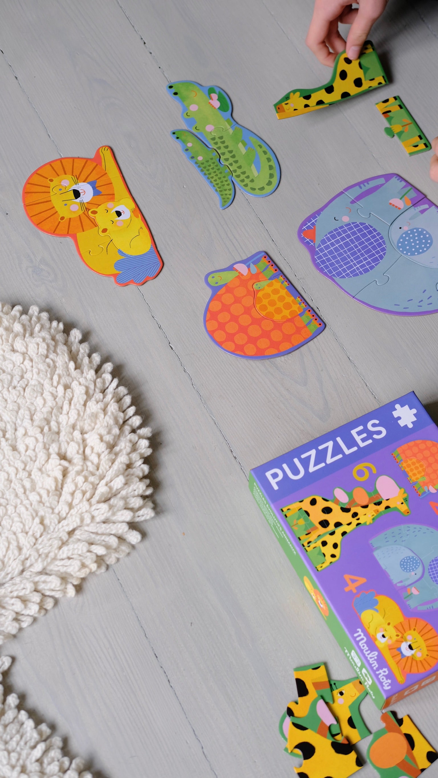 En æske med fem forskellige puslespil med 2 til 6 brikker – perfekt til små hænder, og til børn, der er ved at lære at tælle.