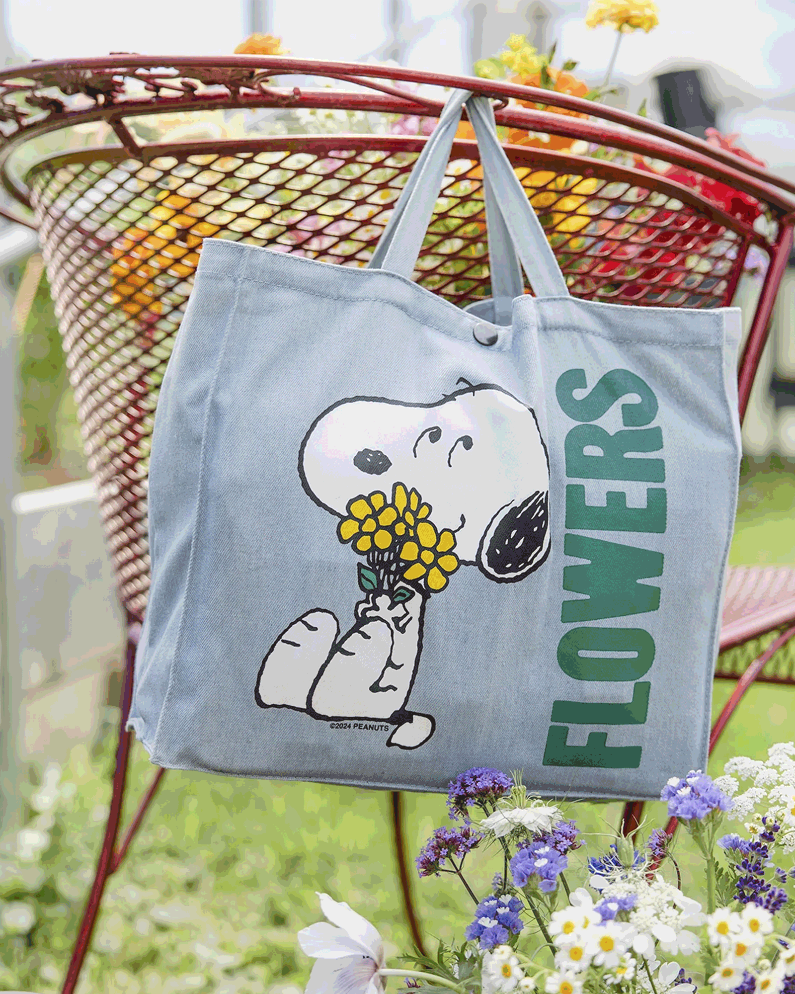 En klassisk tote med korte håndtag og knap-lukning i midten. Snoopy er printet på begge sider, og toten har med sin form og stil et vintage look – præcis som de originale Snoopy totes fra 1960erne og 70erne.