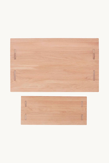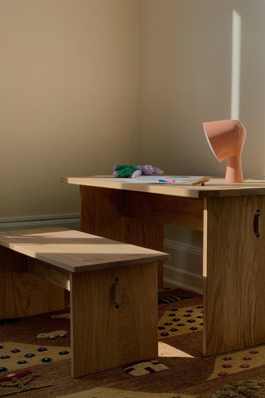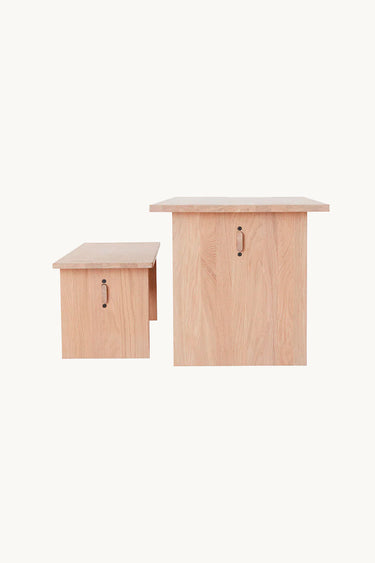 Sammen med Arca Bordet udgør bænk og bord et utroligt smukt sæt, hvor der kan tegnes og leges. Et sæt, der ældes smukt og får sit helt eget udtryk som børnene leger ved det, og giver det tegn på brug.