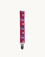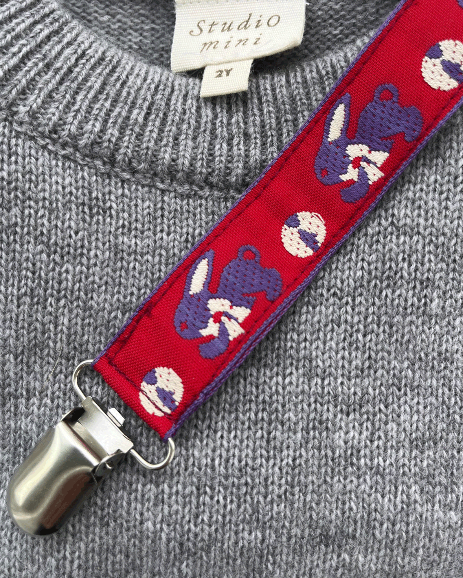 Hver suttesnor kommer med en klemme, som nemt fastgøres et sted på dit barns tøj, og en elastisk, hvorpå sutten nemt sættes fast.
