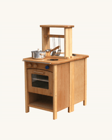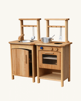 Et smukt, håndlavet legekøkken i træ bestående af to elementer, der kan placeres sammen eller stå hver for sig.
