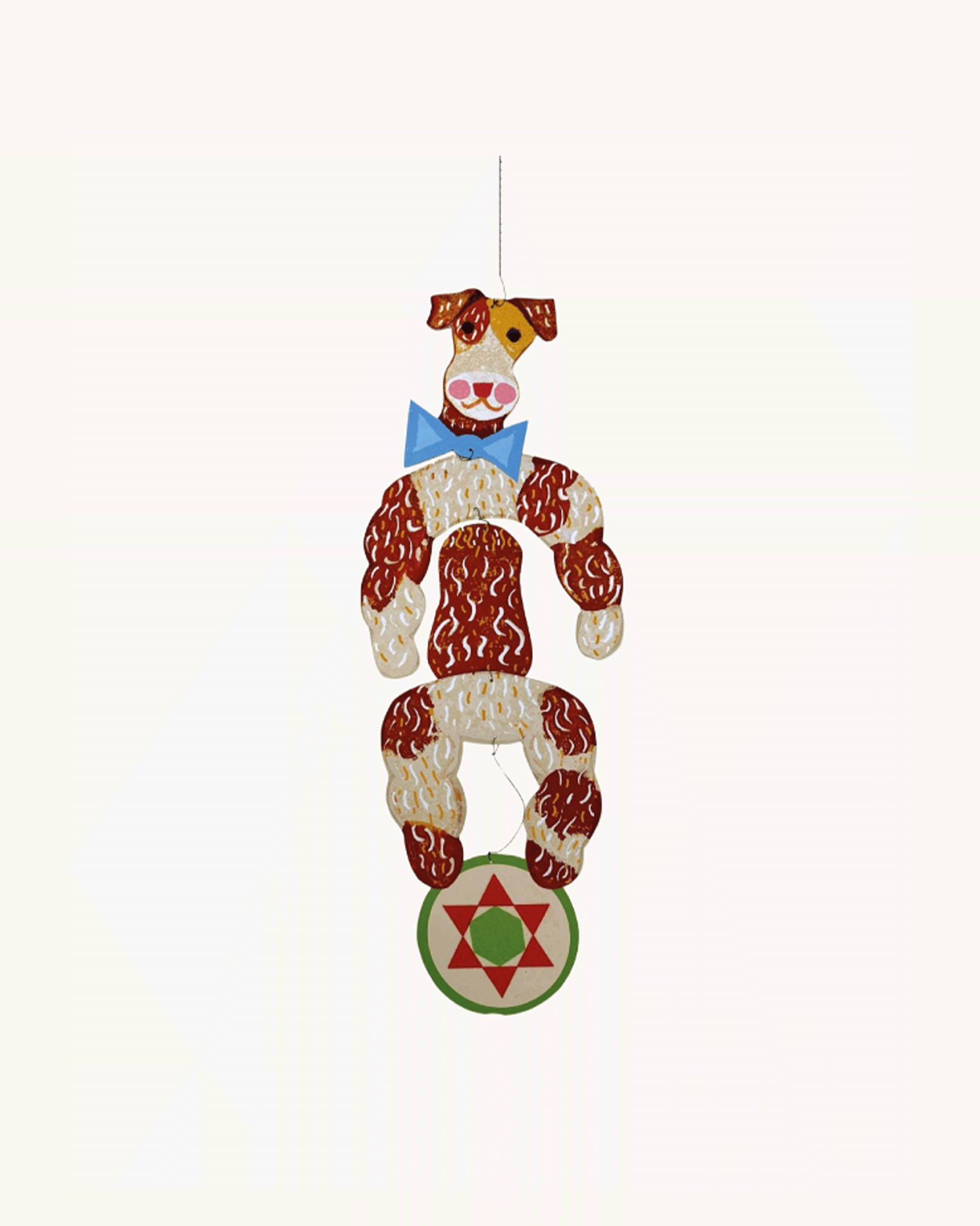 En håndlavet og fin cirkus hund uro, der hænger roligt og bevæger sig stille, som luft kommer ind i værelset.