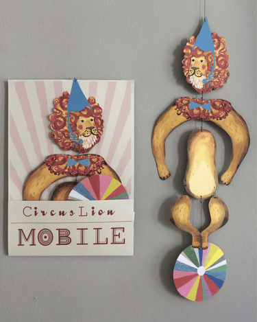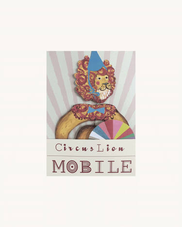 En håndlavet og fin cirkus løve uro, der hænger roligt og bevæger sig stille, som luft kommer ind i værelset.