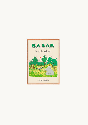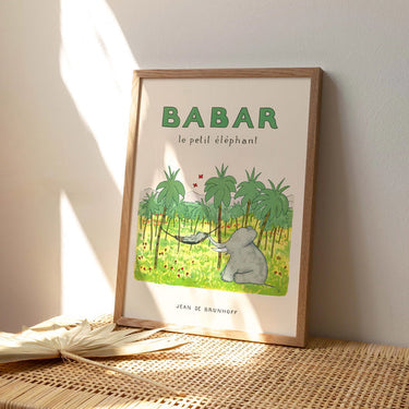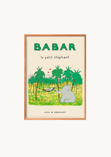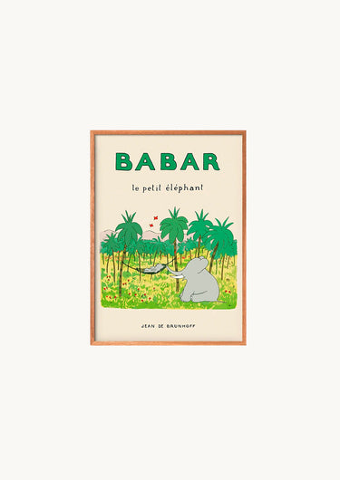 Denne fine plakat viser Babar i en hængekøje midt ude i junglen. Plakaten kommer i smukke farver med creme og forskellige toner af grøn.