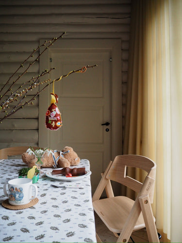 Klapp-højstolen er designet af det norske mærke Kaos, og repræsenterer en helt ny type af højstol, der på smukkeste vis kombinerer æstetik og funktionalitet. Stolen har et naturligt, stilrent og moderne udtryk, og kan foldes sammen, når den ikke er i brug. Sammeklappet fylder den kun 13 cm i bredden, og kan stå bag en dør.