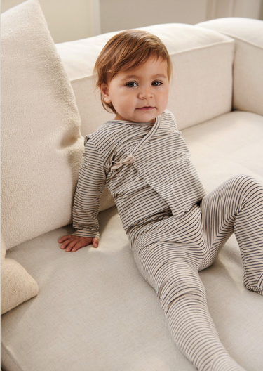Stribede leggings med fødder, der er fremstilet af 100% blød, økologisk bomuld, holder baby varm og behagelig dagen lang.