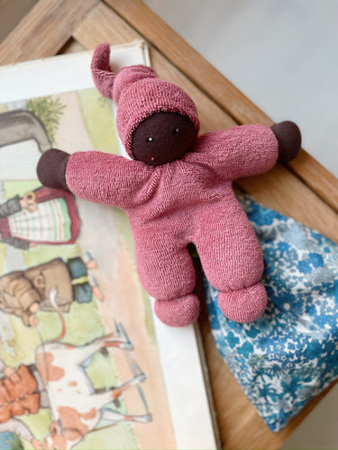 En sød og blød lille dukke til baby, der nænsomt er fremstillet i Tyskland af 100% certificeret økologisk bomuldsfrotte, med fyld af 100% økologisk uld.
