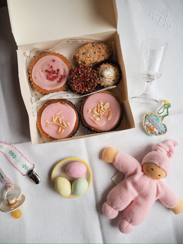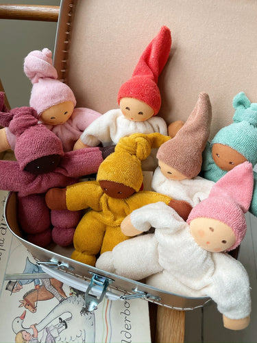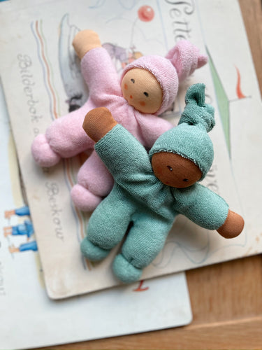 En sød og blød lille dukke til baby, der nænsomt er fremstillet i Tyskland af 100% certificeret økologisk bomuldsfrotte, med fyld af 100% økologisk uld.