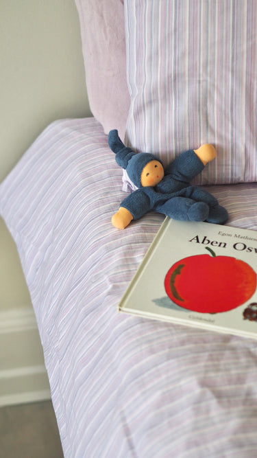 En sød og blød lille dukke til baby, der nænsomt er fremstillet i Tyskland af 100% certificeret økologisk bomuldsfrotte, med fyld af 100% økologisk uld.
