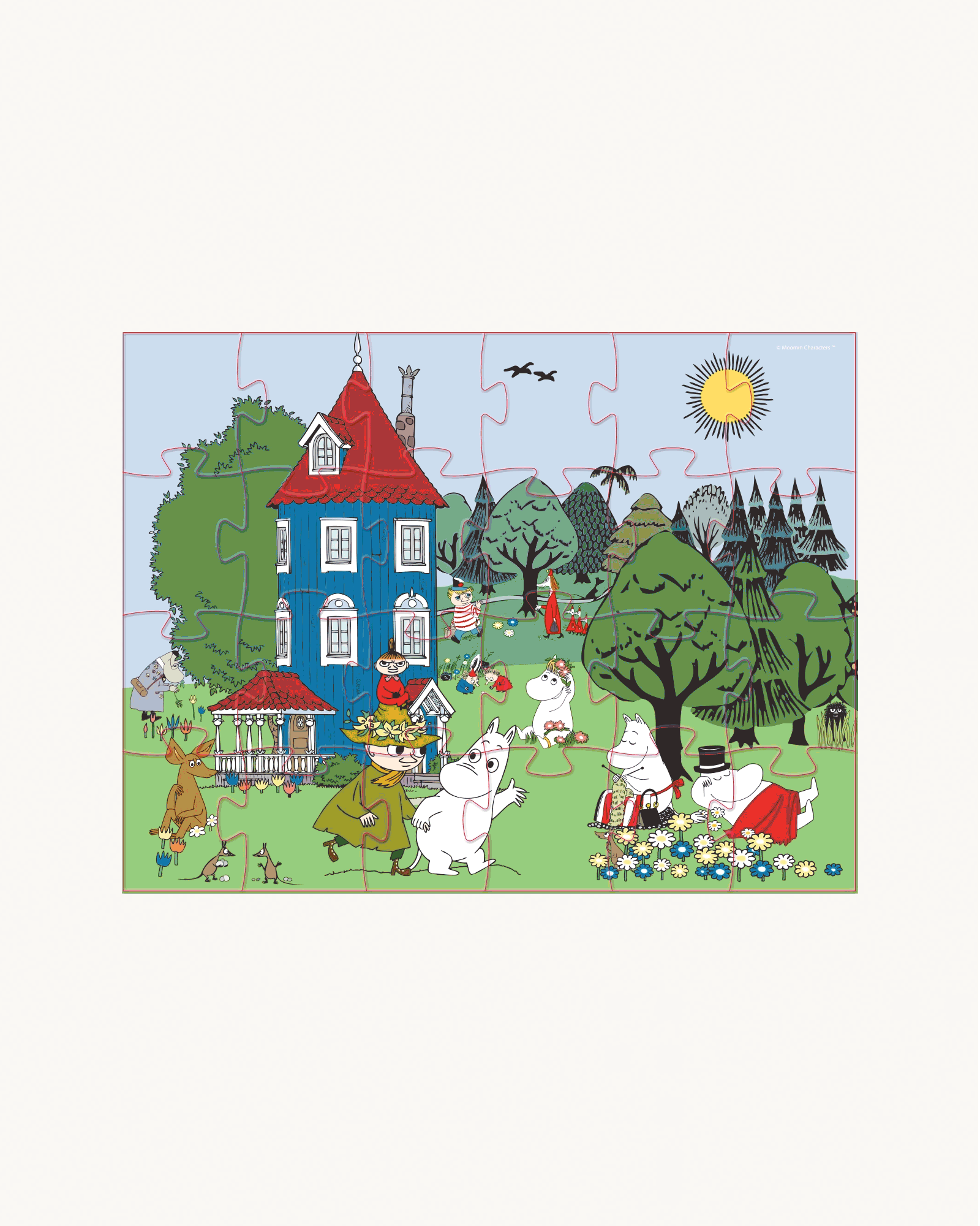 Et sødt puslespil til de mindste, med figurerne fra Mumidalen foran det høje Mumihus. Puslespillet kommer i en skøn figur-formet kasse, der er fin på hylden når det ikke er i brug.
