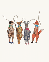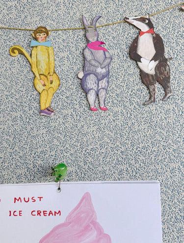 En fin, håndlavet guirlande med 12 søde og sjove dyr, bl.a. grævling, abe, hund, kat og kanin.