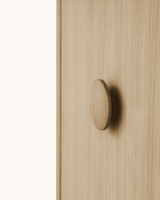 Wood puslekommode med 3 skuffer er fremstillet af MDF fineret med eg. Ben, knager og sidepaneler på puslepladen er i hvidolieret massiv eg. Indersiden af skufferne er lavet af hvidmalet MDF. Ikke-synlige skruer. Greb i 100 % kernelæder.