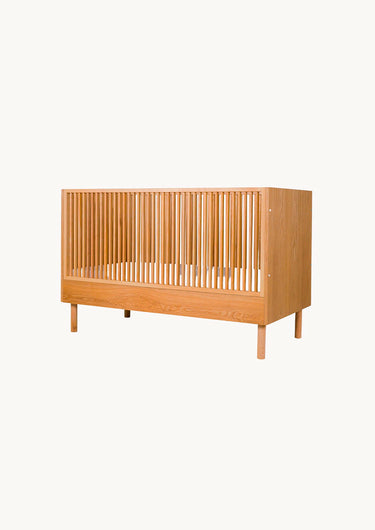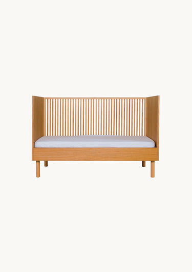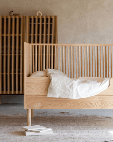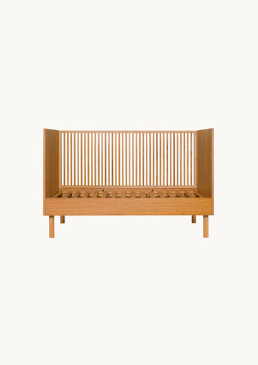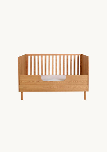 En smuk, enkel tremmeseng fremstillet i solidt asketræ.