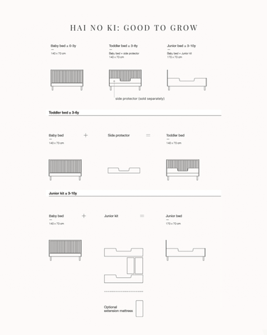 Når jeres barn er klar fra at skifte tremmeseng ud med en juniorseng fjernes den ene side helt. I kan her vælge at tilføje Hai No Ki Sengehesten for at give lidt ekstra sikkerhed, eller I kan lade siden være helt åben og fri. Sengen er nu en juniorseng med samme liggemål, som da den var tremmeseng: 70x140 cm.