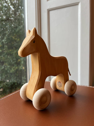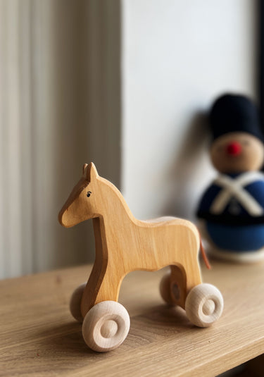 Hesten er et skønt stykke naturligt legetøj, men også en fin på hylden eller i vindueskarmen når den ikke er i brug.