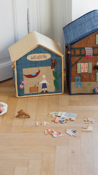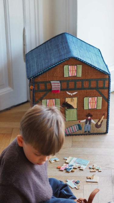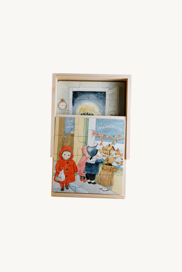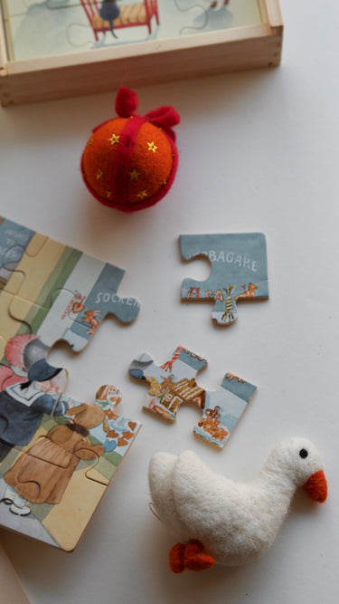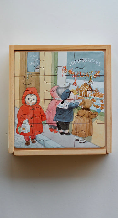 Hvert puslespil består af 12 træbrikker, som passer sammen og udgør fire søde illustrationer af svenske Lena Anderson.