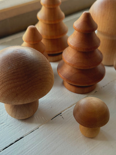 Et skønt lege- og dekorationssæt bestående af fire svampe og tre træer, fremstillet i hånden i massivt træ.