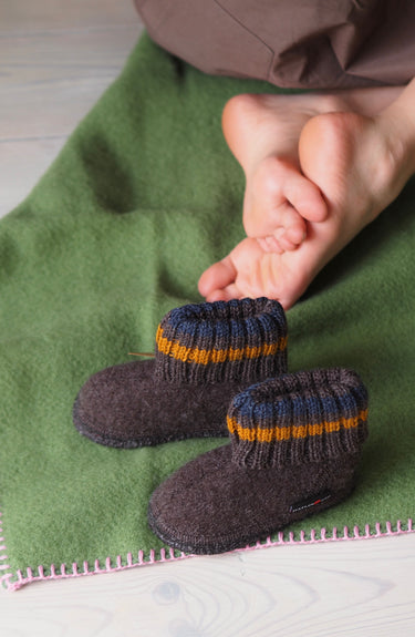 Skoen er fremstillet i uld og kommer med rib ved ankel, så den både varmer godt og sidder godt fast. Sålen er uld filt, som er dyppet i gummi, så dit barn står bedre fast.