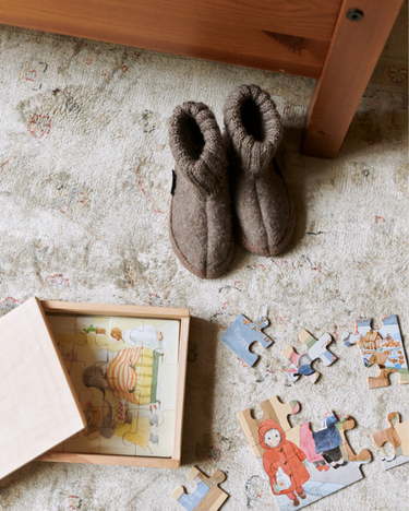 Skoen er fremstillet i uld og kommer med rib ved ankel, så den både varmer godt og sidder godt fast. Sålen er uld filt, som er dyppet i gummi, så dit barn står bedre fast.