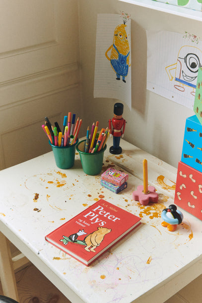 Seen here: Willy the Wooden Horse in the window sill, a classic drum, and two enamel cups used as storage on the desk for pens and markers.