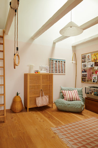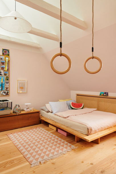 Shelving on the wall (similar one here) is where Ellie has all of her crochet things, some books, a few pictures and smaller belongings. Hanging from the beams is a pair of gymnastic rings, and to the right are the stairs leading up the loft space.