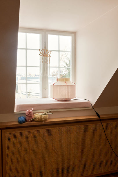 A cushion is added to the window still, and is a lovely place for Ellie to sit and crochet. The Bonbon shade is designed by Ana Kras for Hay.