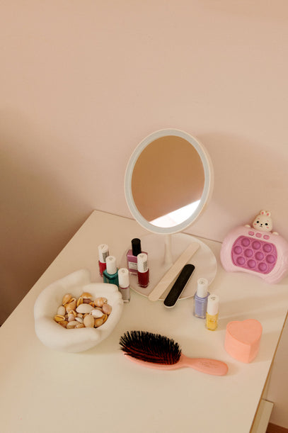Little shells in a bowl shaped like a hand next to nail polishes and a pink brush from Mason Pearson.