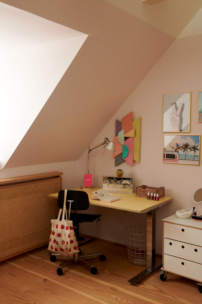 The yellow desk is originally from Cecilie Bahnsen's old office space, and is now the center piece of Ellie's creative corner. Also seen here: A Kevi Chair from Montana (find Kevi Kids Chairs here), and a Tolomeo Lamp from Artemide.