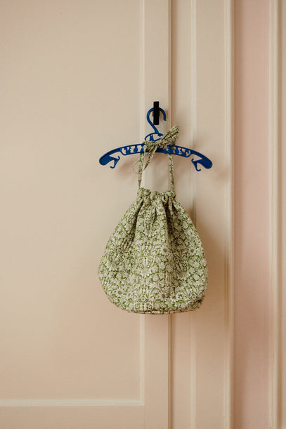 A Liberty pouch is used to store some of Ellie's yarn and crochet things. The pouch hangs on a door knob with the help from a baby hanger.