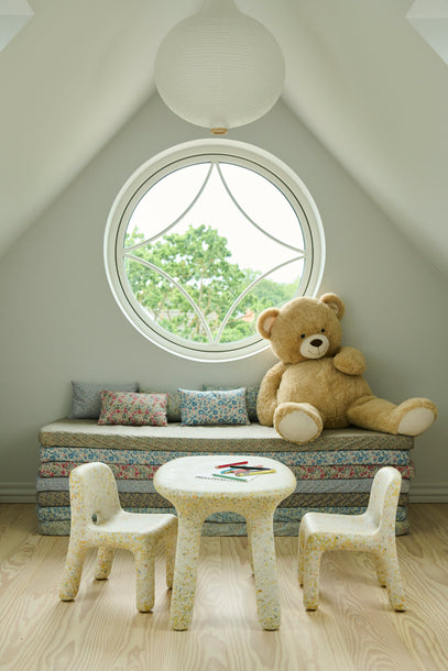 It's also here that chairs and the matching Luisa table in vanilla from ecoBirdy take centerstage amongst other toys, dress-up clothes and balance boards.