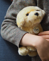 This golden-haired little teddy is the perfect companion around the house, and maybe on road trips and when traveling? She has a great size for cuddling and is easy to bring along where ever you go.