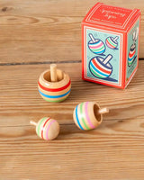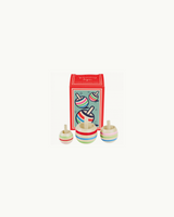 Enjoy a classic game with this set of three small wooden spinning tops. Each top is painted with colorful stripes and comes in different sizes – perfect for fun play for both little ones and grown-ups.