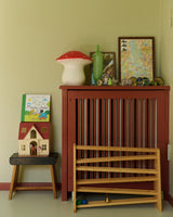 A beautiful, handmade wooden ball track that comes with 3 wooden marbles in green, blue and red, and a bell that rings once the balls hit it when reaching the final bar.