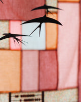 The Five Flying Swallows mobile is made out of cardboard, and is easily hung in the ceiling over your baby's crib, changing table or elsewhere in your home.