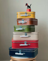 This cardboard suitcase come with cream coloured thread overstitching, and with a metal lining protecting the edges.