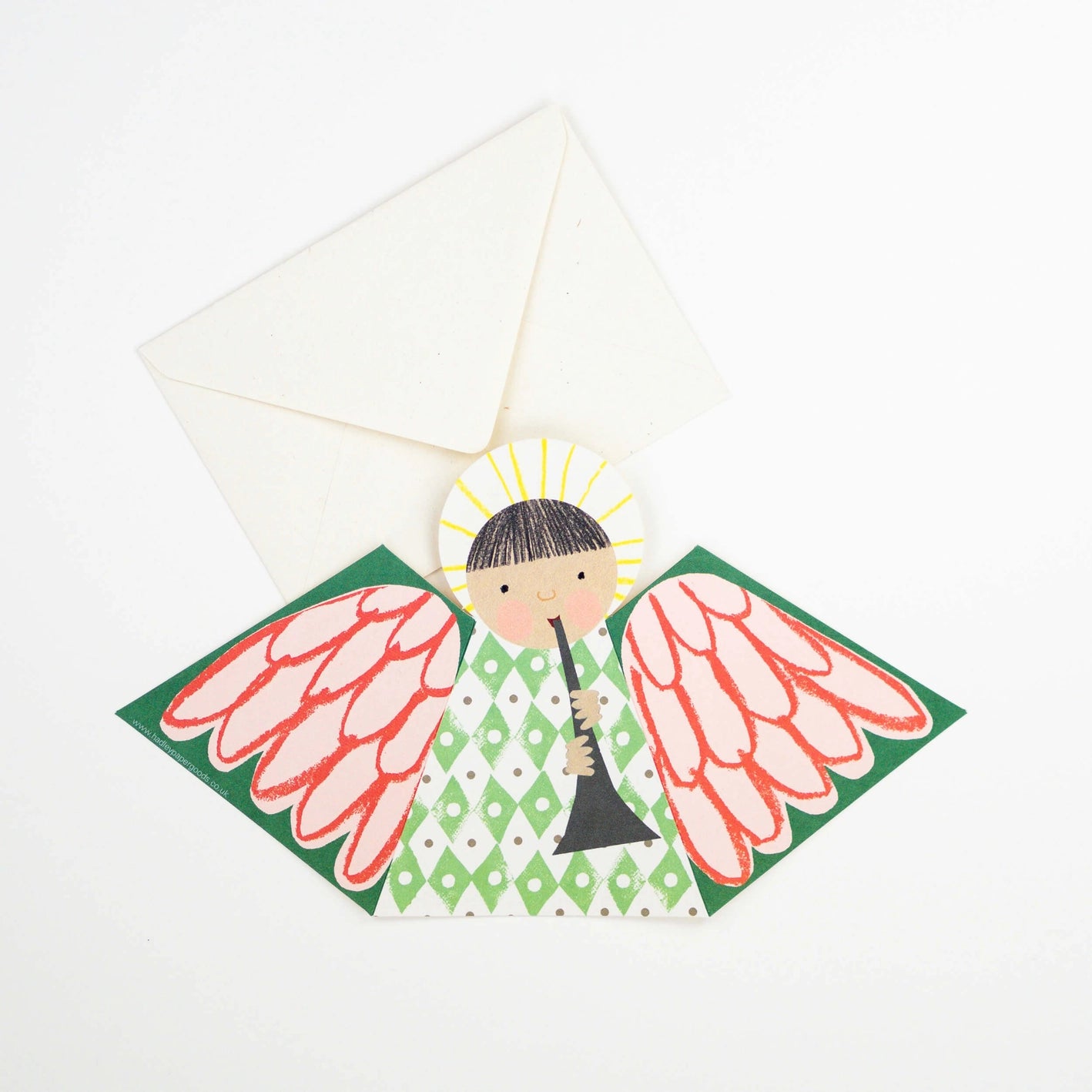 Wish someone you love a merry Christmas with this lovely fold-out card – or fold it and use as Christmas decor in your own home: This is a sweet choir angel card iwith fold-out wings so it stands beautifully on display.
