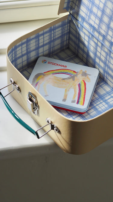Each suitcase is made of sturdy cardboard with a paper-coated surfaces, and with a metal lining protecting the edges.