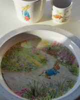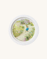 A beautiful melamine plate that is beautifully decorated with illustrations of Peter the Rabbit.