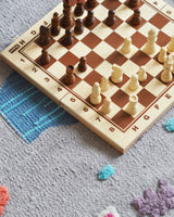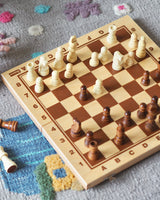 A classic game of chess in a beautiful wooden suitcase, made by the French brand Jeujura. The suitcase makes it easy to take the game on the go and keep all the pieces neatly stored when not in use.