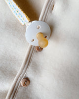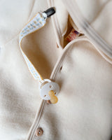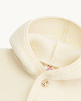 A classic baby suit that comes with a hoodie, rounded neck, classic fit and long sleeves. It comes with wooden buttons that go down the front.