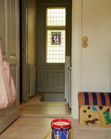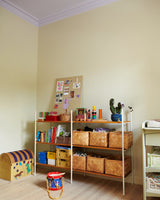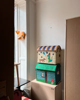 Pretty colours, a practical lid (the roof of the house), and wonderful, embroidered details make this storage basket suitable to place anywhere in the house.