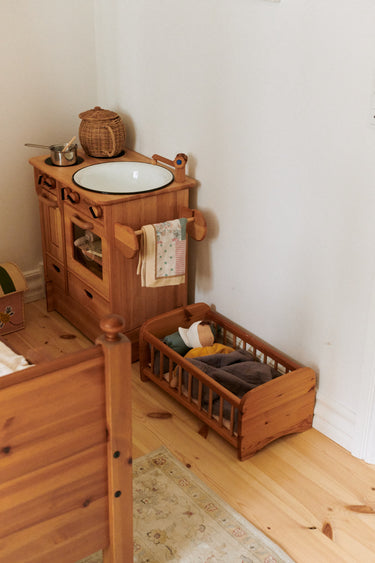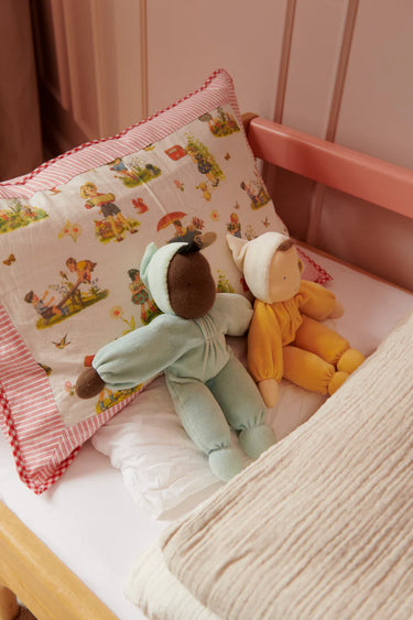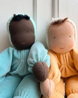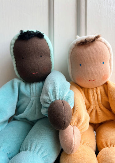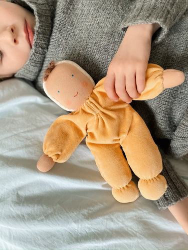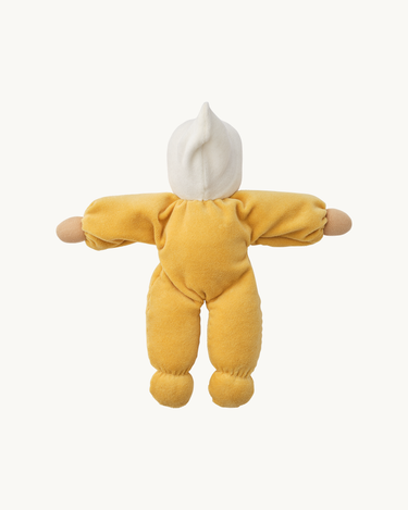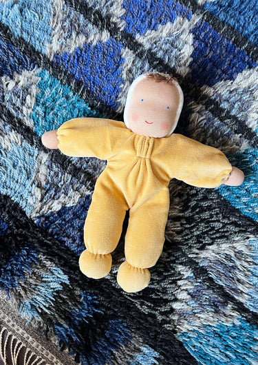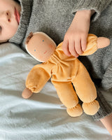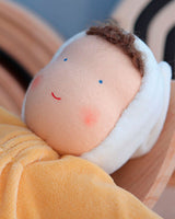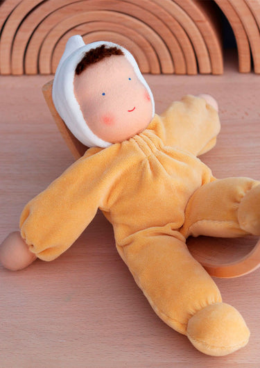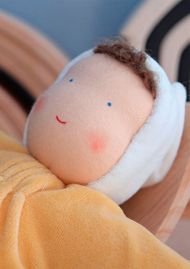 The doll's face is hand painted in a traditional Waldorf way with few features enabling babies and children to use their imagination and let play and creativity run free.