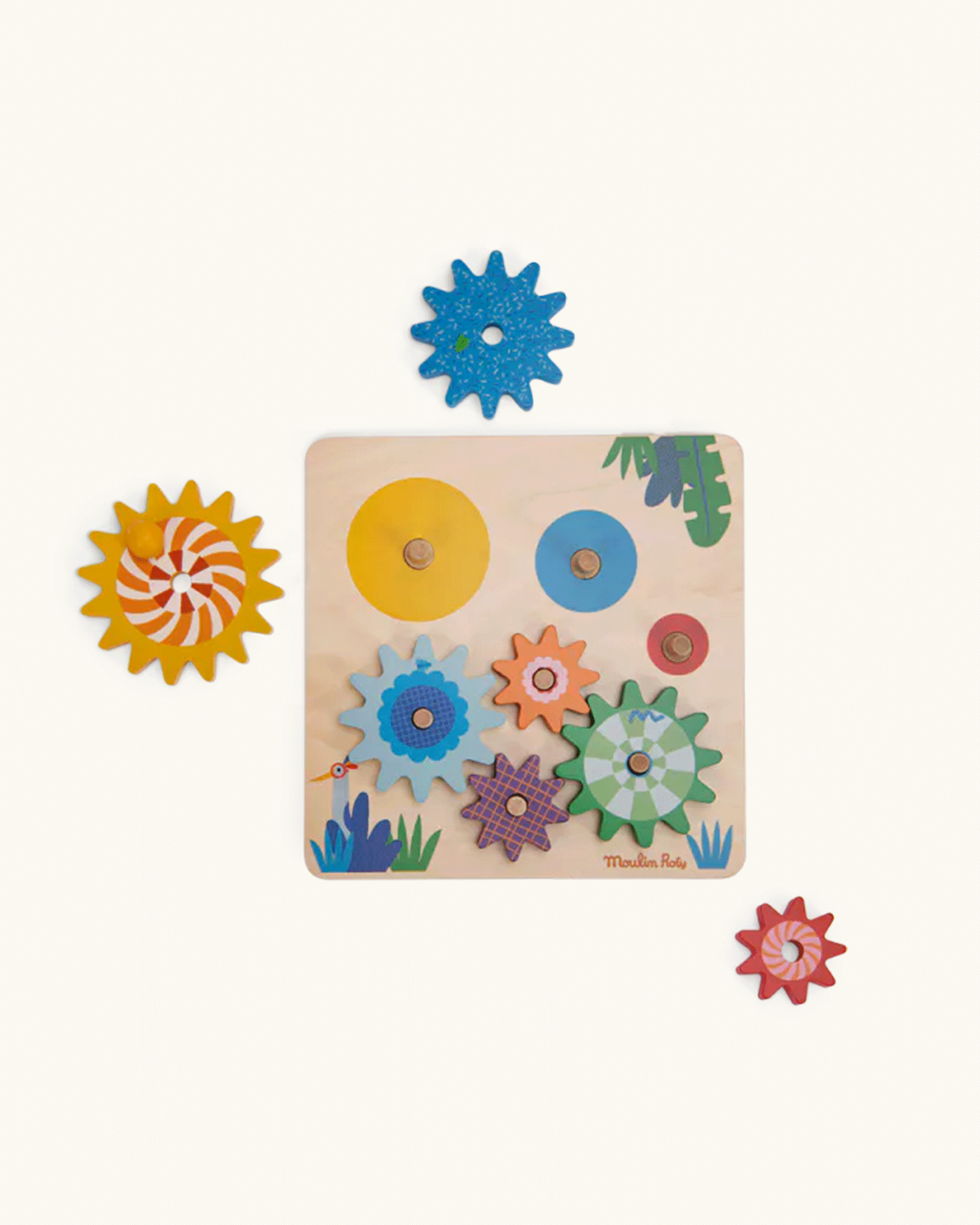 Seven multicolored cogwheels to position correctly on the wooden pillars. By turning the yellow wheel with the handle, the whole thing starts to spin in all directions.